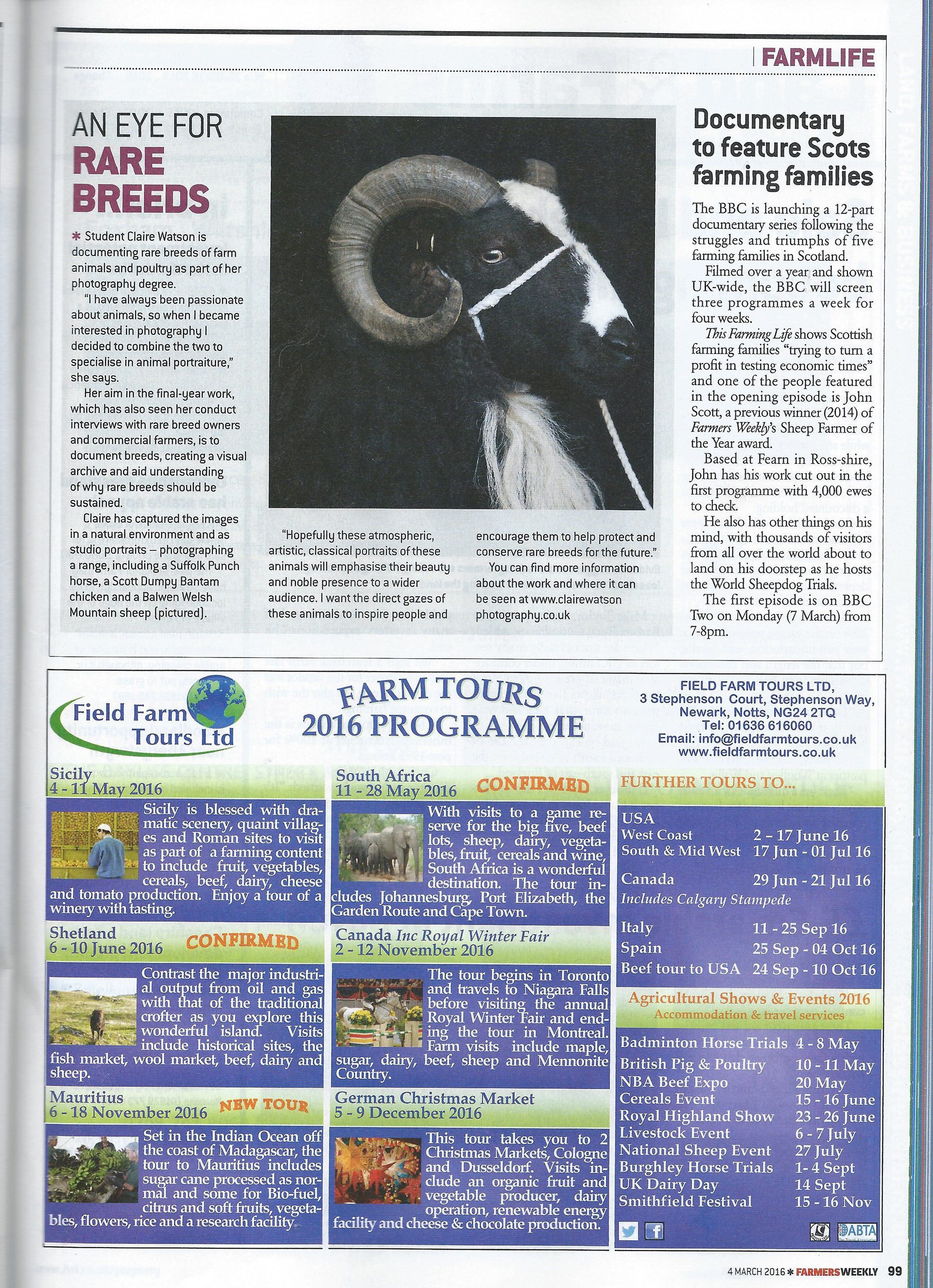 An article about my rare breeds photography project in the Farmers Weekly magazine March 2016 edition.